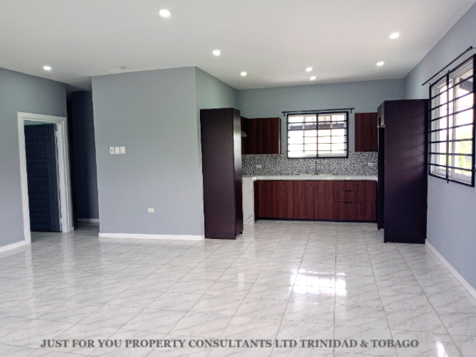 This welcoming brand new 2 BR 1 bath upper floor apartment is conveniently located in a serene neighborhood in Chaguanas Trinidad. It contains a spacious open living, dining & kitchen layout; is tiled throughout; has gypsum ceiling with down- lighters; possess A.C in both BRs; has sufficient built in closets; an indoor laundry area, secure parking, adequate water storage facilities, motorized gates & perimeter fencing; this unit is easily accessible & is less than 3 mins away from the highway/ all major roadways (Price includes wifi/cable) .